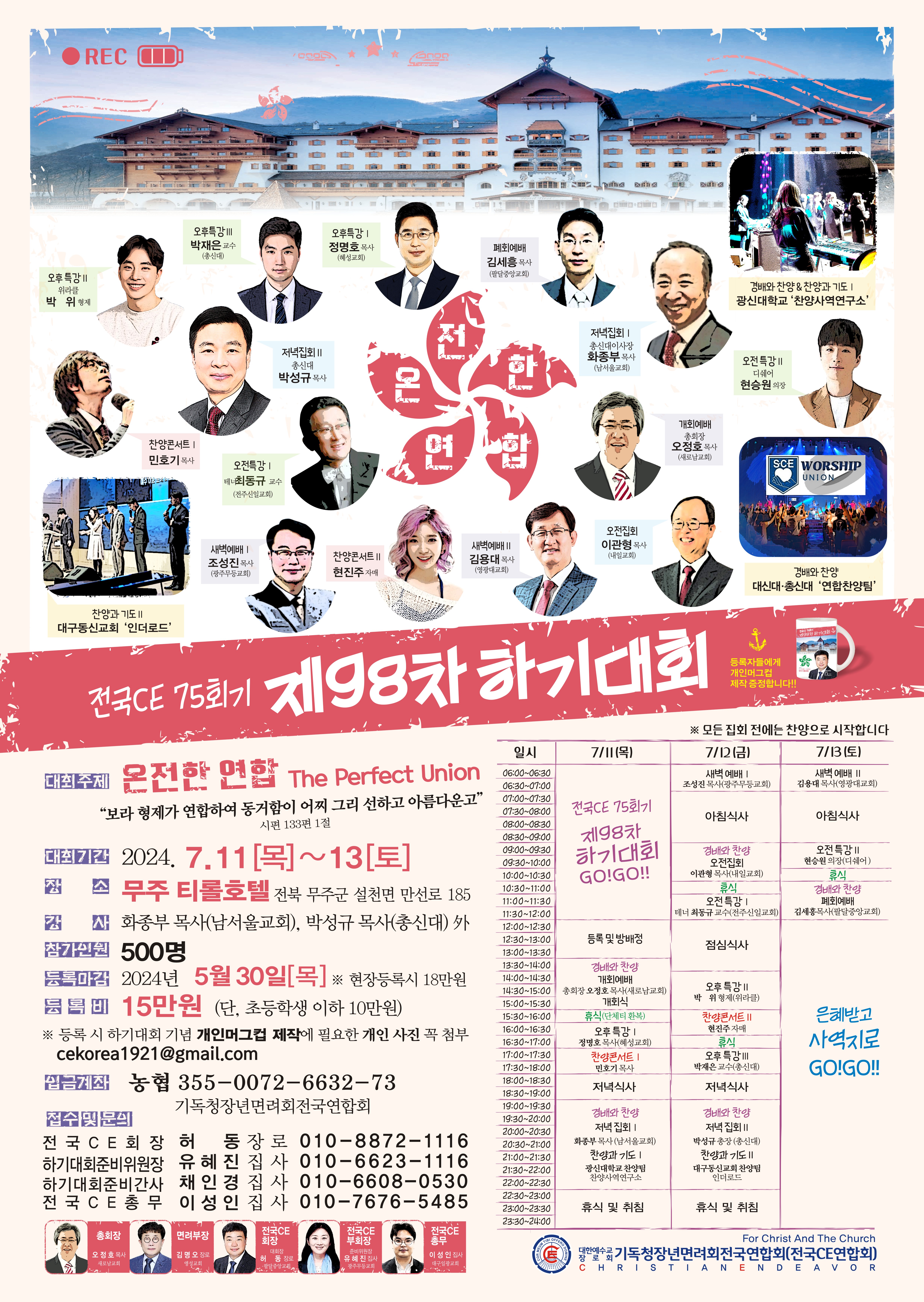 -일시: 7월11일(목) - 13일(토) *2박3일 -장소: 무주티롤호텔 (전북 무주군 설천면 만선로 185)-주강사: 박성규 총장(총신대), 화종부 목사(남서울교회) 98차 하기대회 일정 장소 강사 게스트가 확정되었습니다. 등록과 홍보를 위한 작업이 진행중입니다. 업데이트 되는대로 공지토록 하겠습니다. 은혜로운 집회가 되도록 기도해주시고 많은 전국의 청장년 리더와 지도자들이 참가하여 민족과 교회 열방을 회복시킬 수 있도록 참여를 부탁드립니다. 개회예배/ 총회장 오정호 목사(새로남) 저녁집회/ 화종부 목사(남서울), 박성규 총장(총신대) 오전집회/ 이관형 목사(내일) 폐회예배/ 김세흥 목사(팔달중앙) 오전특강/ 최동규 교수(전주신일), 현승원 의장(디웨어) 오후특강/ 정명호 목사(혜성), 박위 형제(위라클) 박재은 교수(총신대) 찬양콘서트/ 민호기 목사, 현진주 자매 새벽예배/ 조성진 목사(광주무등), 김용대 목사(영광대) 찬양팀/ 광신대 찬양사역연구소 대구동신교회(아포슬청년) 인더로드 대신대,총신대 SCE 연합찬양팀