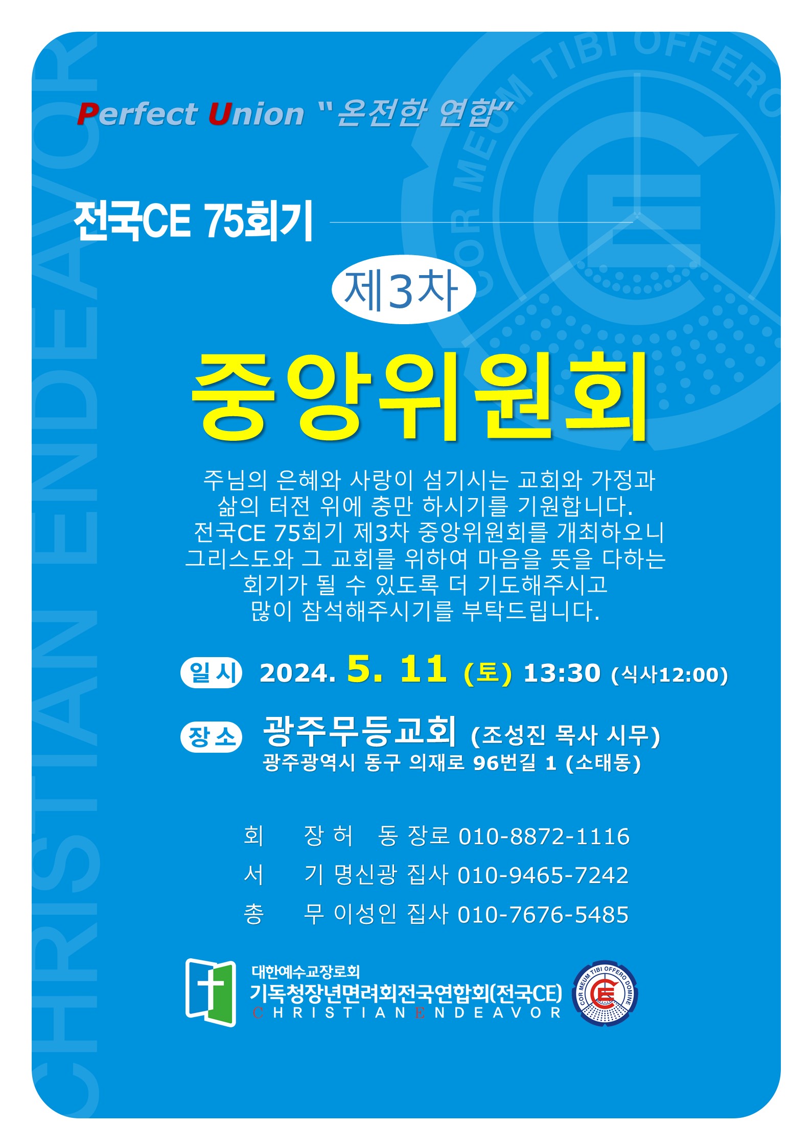 3차 중앙위원회 -일시: 24.5.11(토) 오후1시30분 *식사12시-장소: 광주무등교회(조성진 목사) 광주시 동구 의재로 96번길1 행사와 일정이 많은 5월에 열리는 3차중앙위원회에 스케줄 조정 하시어 중앙위원들의 보다 적극적인 참여를 부탁드립니다. [전국CE 75회기] 회장 허 동 장로 서기 명신광 집사 총무 이성인 집사