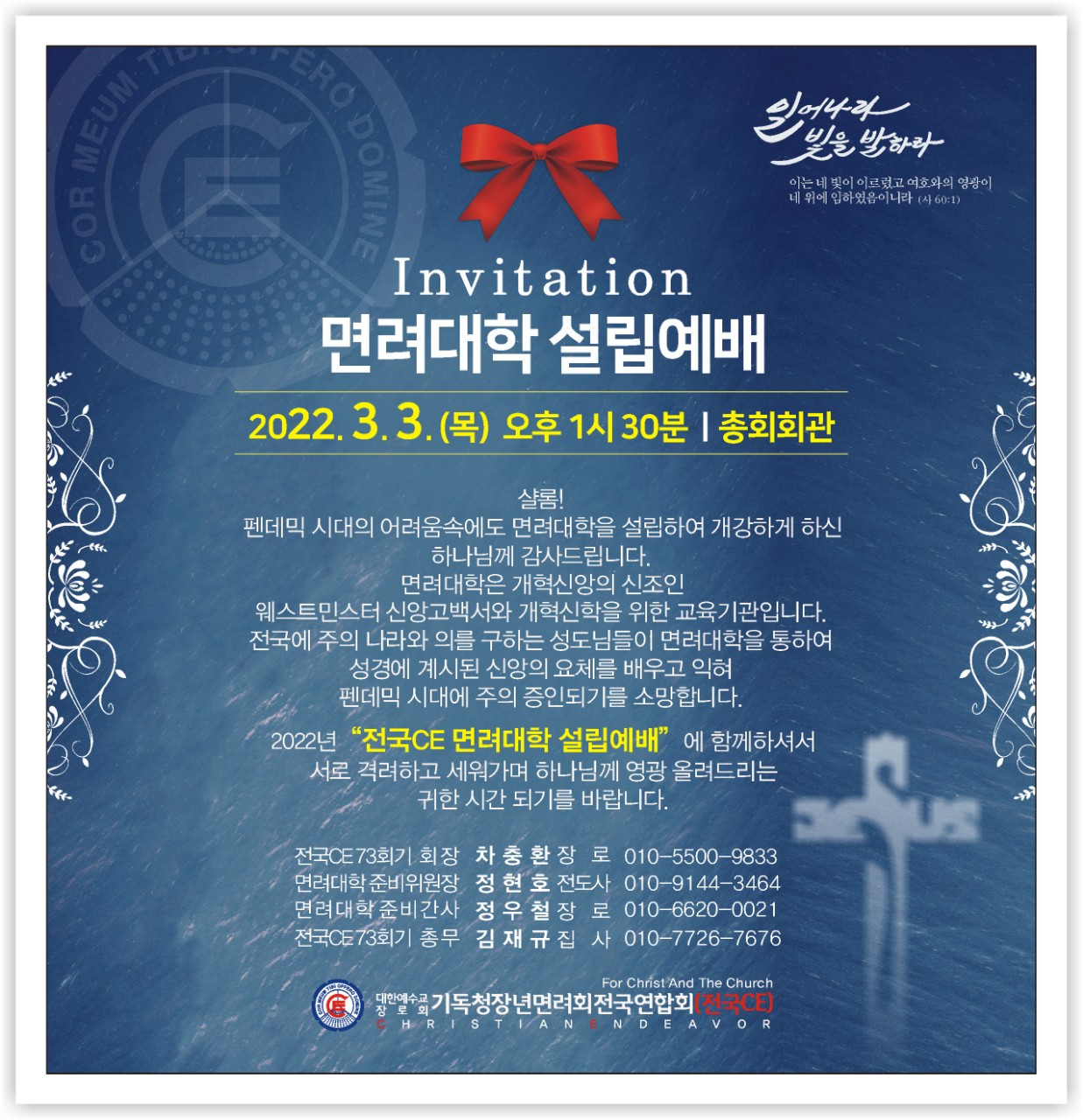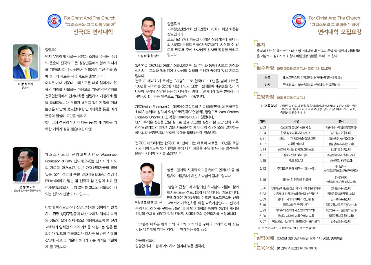 ![]() 그런즉 너희는 먼저 그의 나라와 그의 의를 구하라 그리하면 이 모든 것을 너희에게 더하시리라. <마태복음 6: 33> 샬롬! 펜데믹 시대의 어려움속에도 면려대학을 설립하여 개강하게 하신 하나님께 감사드립니다. 면려대학은 개혁신앙의 신조인 웨스트민스터 신앙고백서와 개혁신학을 위한 교육기관입니다. 전국에 주의 나라와 의를 구하는 성도님들이 면려대학을 통하여 성경에 계시된 신앙의 요체를 배우고 익혀 펜데믹 시대에 주의 증인되기를 소망합니다. 전국의 성도여! 말씀안에서 뜨겁게 기도하며 일어나 빛을 발하라 일어나라 빛을 발하라 이는 네 빛이 이르렀고 여호와의 영광이 네 위에 임하였음이니라 <이사야 60:1> <설립예배> 일정 : 3월 3일(목) 오후 1시30분 장소 : 총회회관 2층 예배실 <교육안내> 1.개강일자 : 3월 22일(화) 오후 7시 2.강의내용 1) 필수과정 : 개혁신앙의 신조인 웨스터민스터 신앙고백서 강의 2) 교양과정 : 펜데믹 시대의 개혁신앙, 성도의 삶, 예배, 기도, 교회, 청장년등과 관련된 교양과정 강의 3) 강의시간 : 매주 화요일과 목요일 오후7시부터 2시간 ~ 3시간씩 (16주) 4) 강의방식 : 대면과 온라인교육(ZOOM)병행 회 장 차충환 장 로 위원장 정현호 전도사 간 사 정우철 장 로 총 무 김재규 집 사